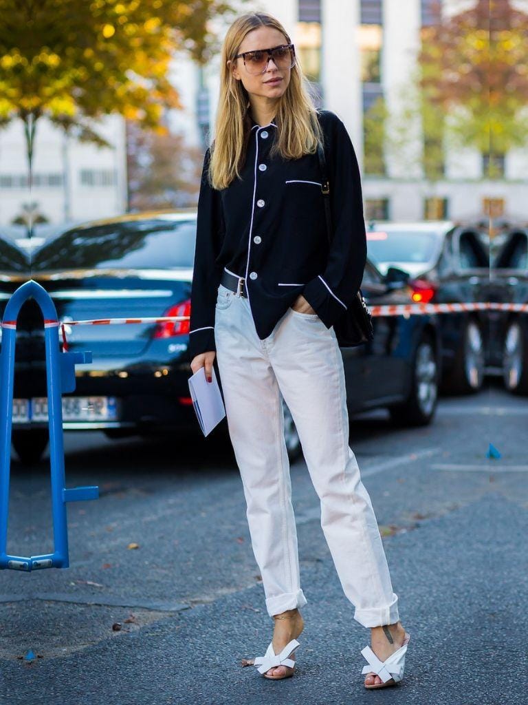 Jeans berwarna putih dan piyama berkerah berwarna hitam bisa jadi andalan untuk kamu pergi ke kantor. Nah, untuk menghindari kesan "b" aja dengan busana monokrom kreasikan kemejamu dan masukan sisi kirinya kedalam celana. Tadaa penampilanmu nampak lebih catchy!