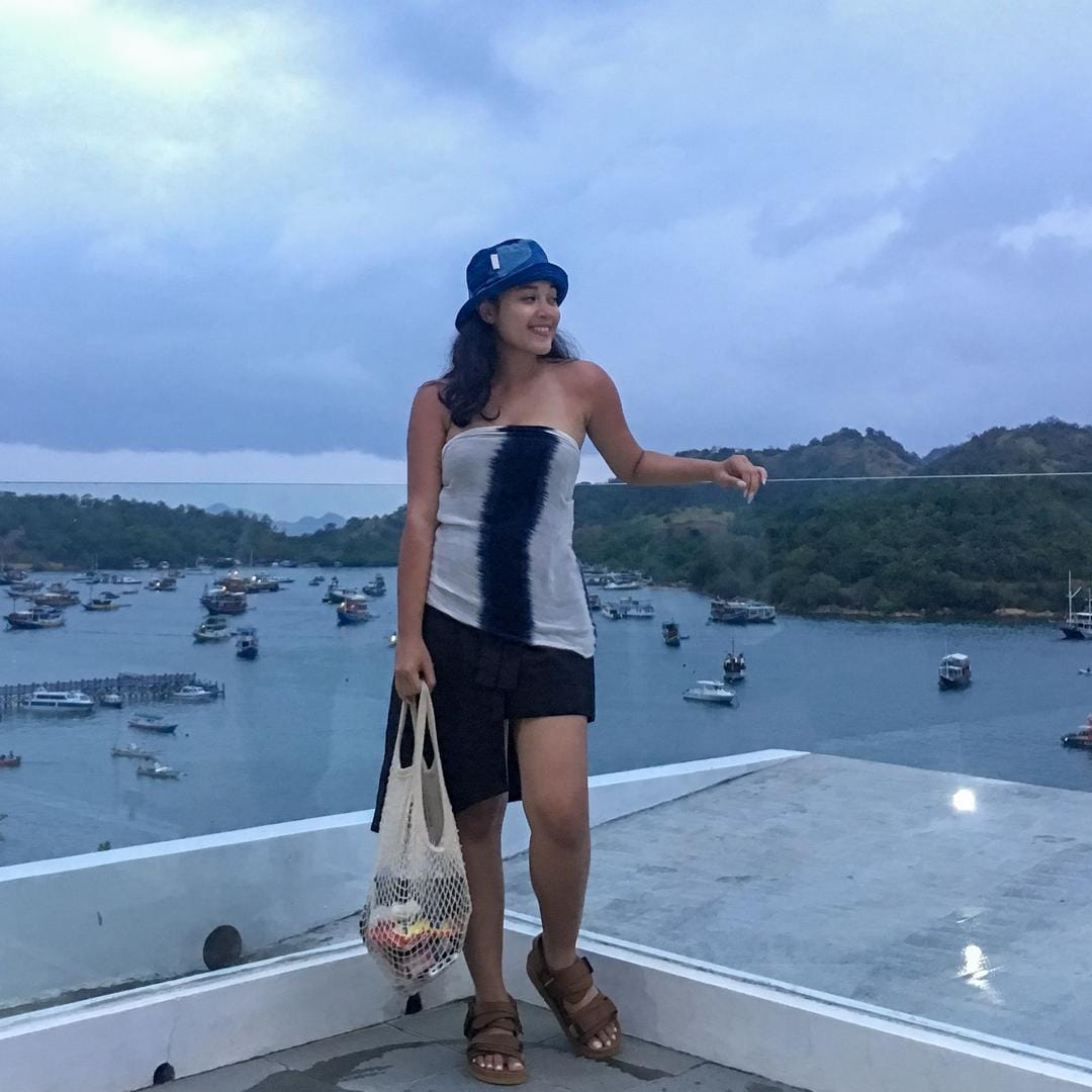 Di hari kedua saya berwisata mengunjungi beberapa pulau wilayah Labuan Bajo, yakni Pulau Kelor dan Pulau Rinca. Sehingga memutuskan untuk memakai denim overall karena praktis dan nyaman. Untuk menghindari kesan plain, item dengan material utama denim ini saya padu-padankan dengan bucket hat motif, bikini warna bold (sebagai dalaman), serta tas pantai net bag.