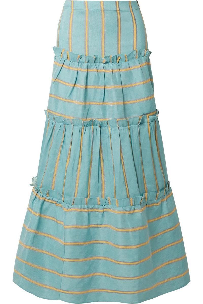 Coquillage tiered striped linen-blend maxi skirt, PAPER London, $310