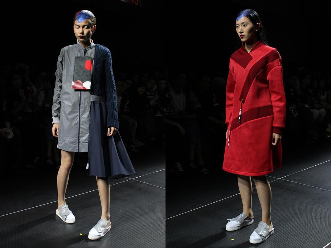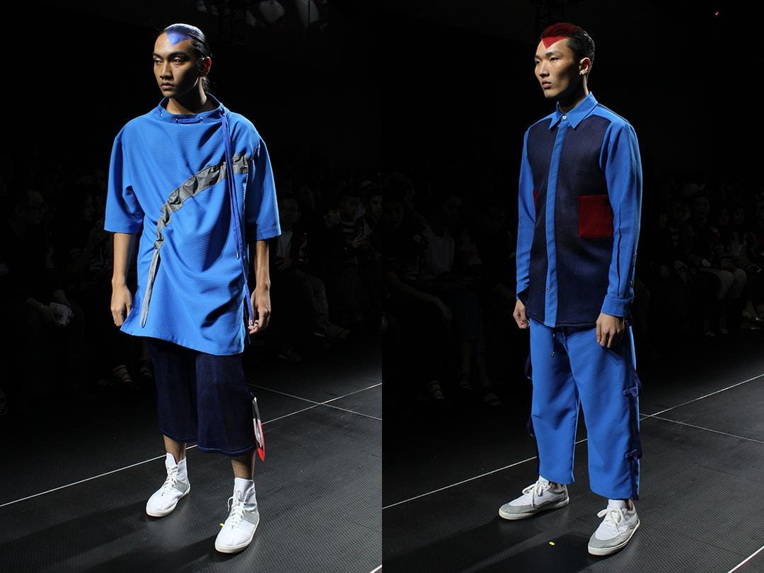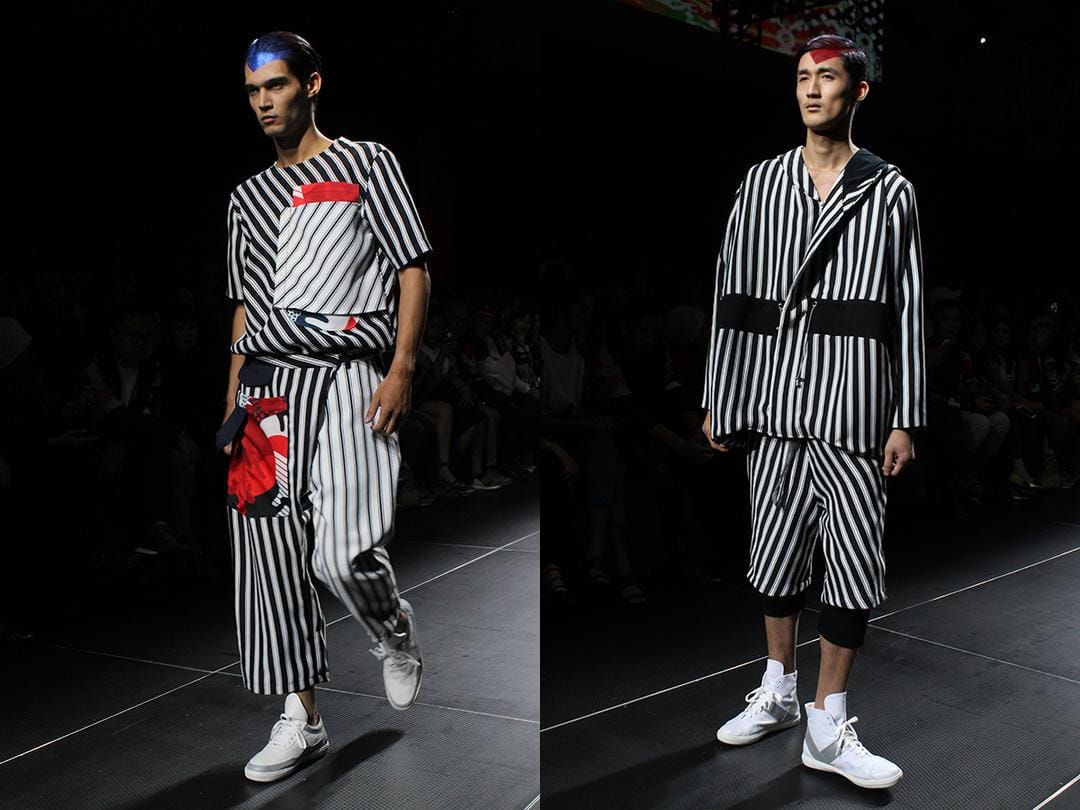 Warna-warna seperti hitam, abu-abu dan putih menjadi tidak biasa, ketika warna merah muncul sebagai pop color-nya. Walau di mata rasanya terkesan mirip dengan palet warna sang kolaborator, untung pada eksekusinya semua tampak young, bold, and fun. Ditambah dengan aksen menarik pada zipper, kantong, dan patches yang di-exaggerated. Motif garis-garis pun menjadi eksplorasi baru untuk koleksi kali ini. Namun tak ketinggalan warna biru yang tidak pernah absen muncul pada kemeja dan berbagai jaket pria - bahkan terlihat menarik di tata rambut para modelnya.