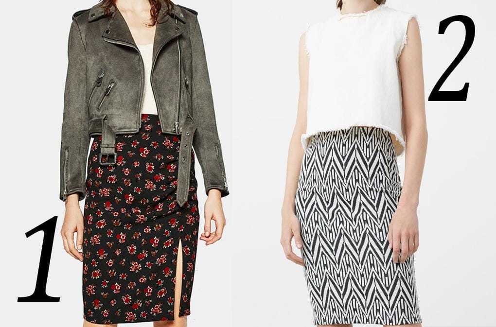 SEE NOW BUY NOW: 1. Stretch pencil skirt, Mango, IDR 349,000 ; 2. Ribbed pencil skirt, ZARA, IDR 599,900