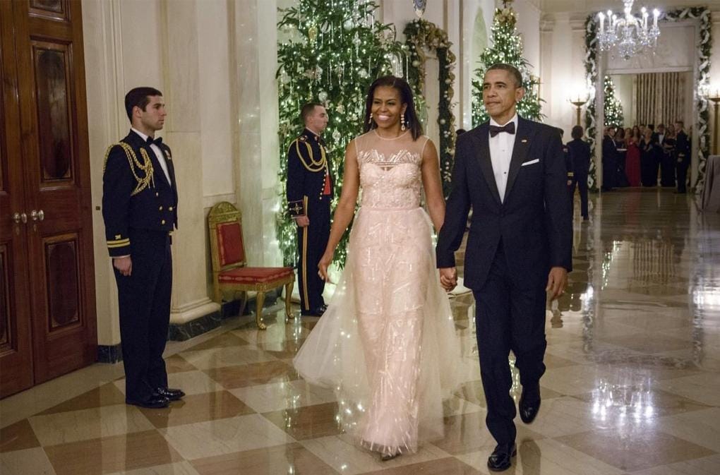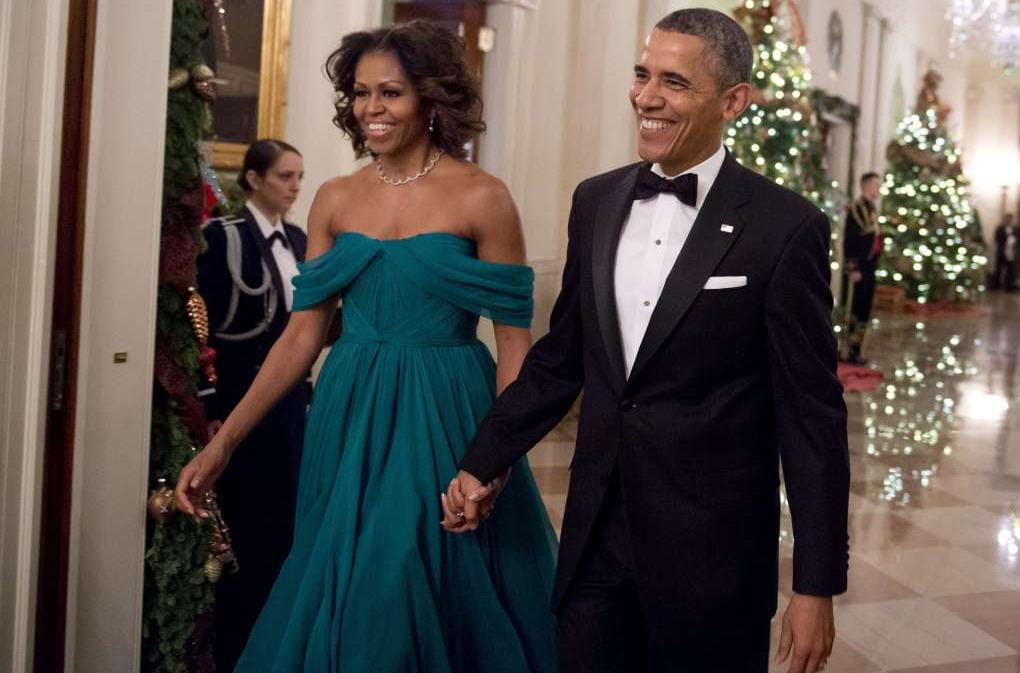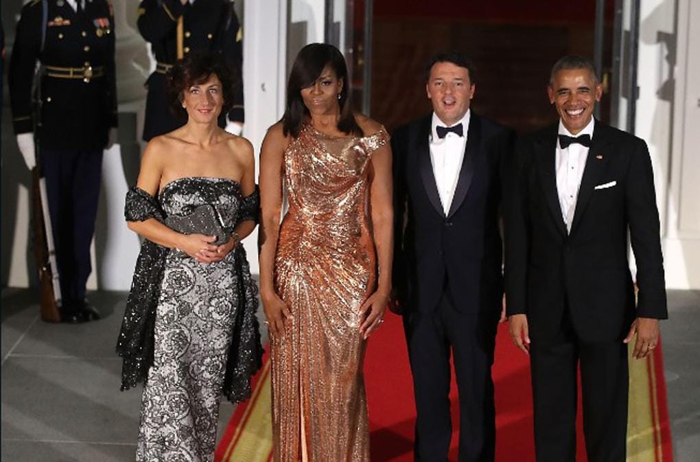 Michelle dan Barack Obama bersama dengan perdana menteri Itali, Matteo Renzi dan Istri. Michelle mengenakan gaun metalik bertaburkan diamonds karya Atelier Versace. Gaun dengan desain off-shoulder yang menciptakan daya tarik sempurna bagi siapapun.