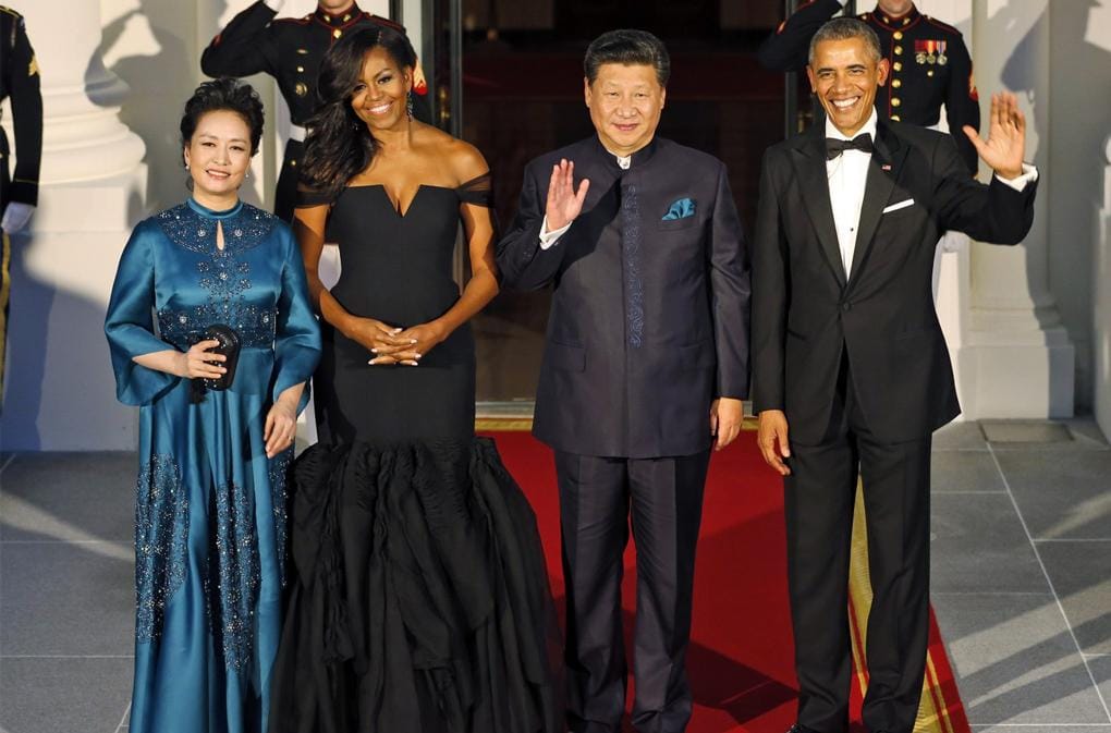 Dalam balutan karya Vera Wang, sang ibu negara menyambut presiden Cina Xi Jinping dan istrinya Peng Liyuan mengenakan gaun hitam yang dihiasi detail ruffle cantik.