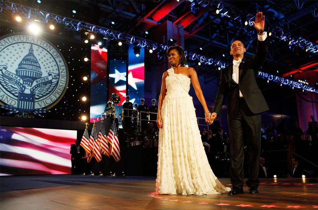 Kali ini Michelle mempercayakan tampilannya pada desainer Jason Wu, gaun putih dengan aplikasi bunga, manik dan desain one shoulder yang cantik untuk malam inagurasi.