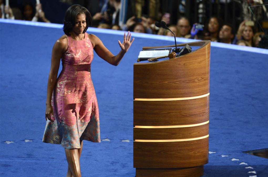 Gaun warna pink berdesain minimalis dengan sentuhan motif abstrak menjadi opsi sempurna Michelle saat menghadiri konfrensi partai Demokrat.