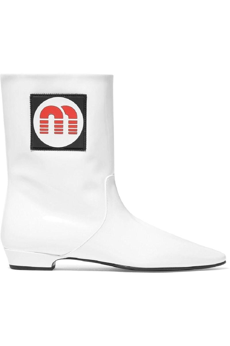 Logo-appliqued patent leather ankle boots, Miu Miu, $1,160