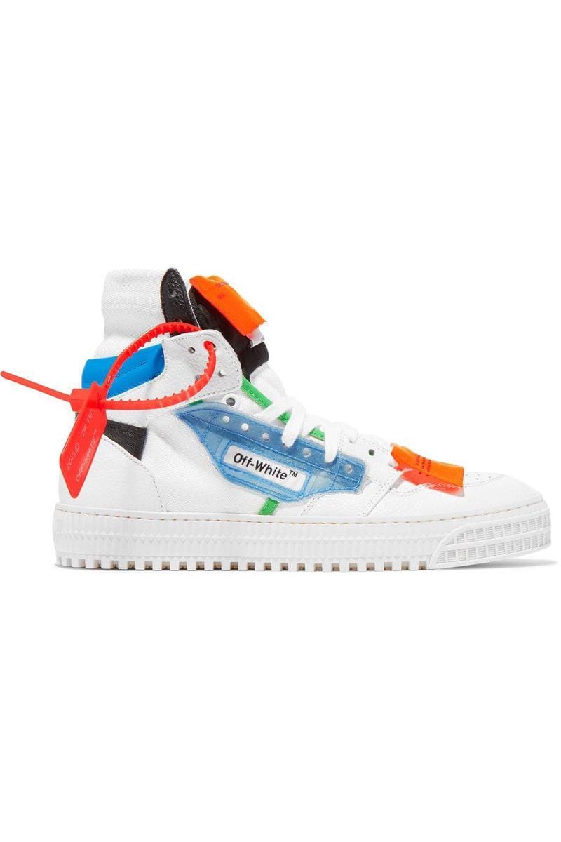 Off-Court logo-embellished canvas and leather high-top sneakers, Off-White, $456