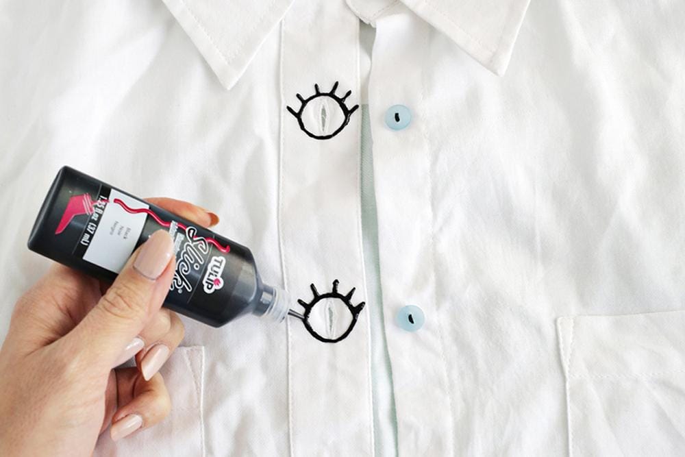 4. Kemudian, buatlah pola mata juga pada sisi kemeja yang memiliki lubang untuk memasukkan kancing menggunakan point fabric puff paint.