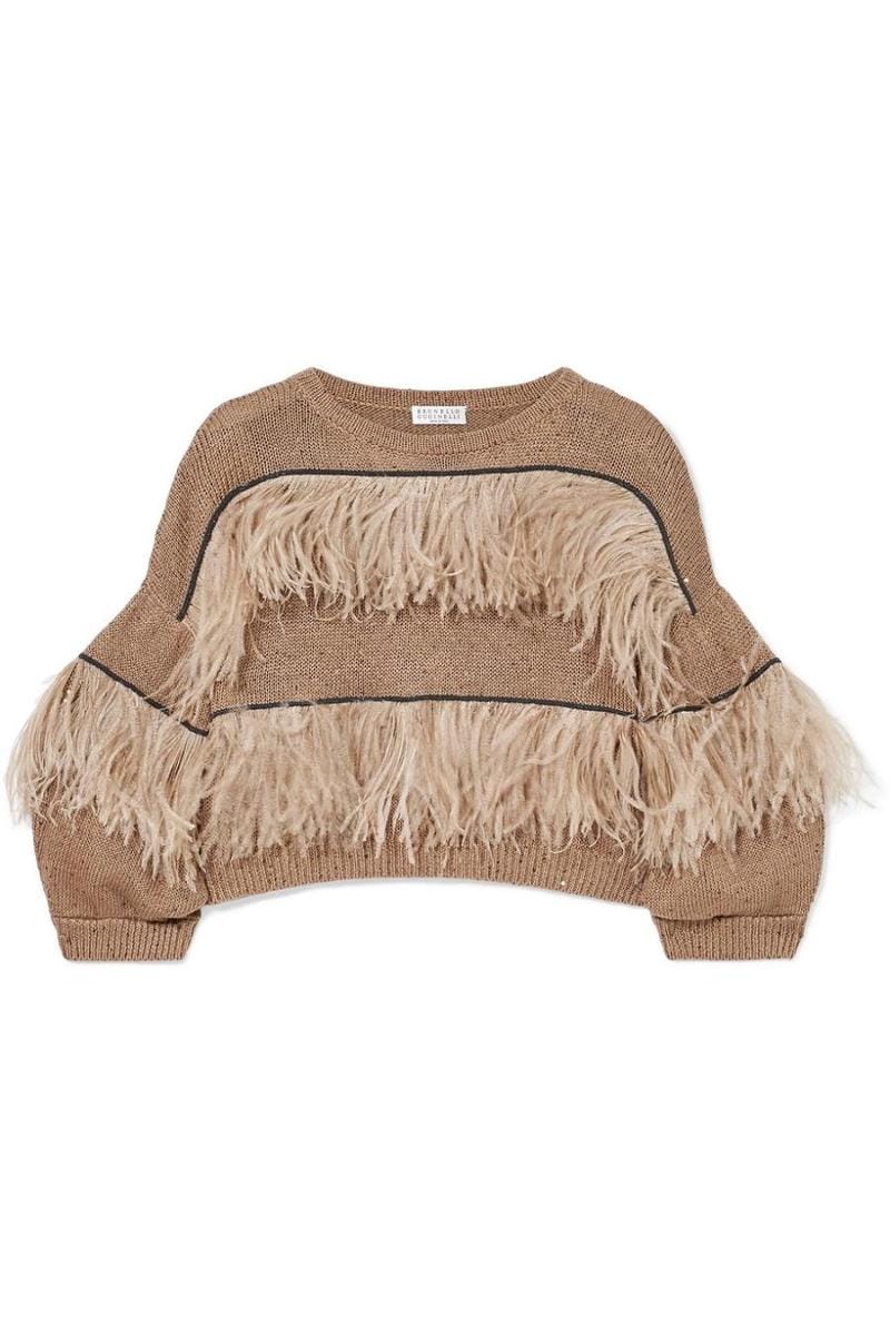 Feather-trimmed embellished cotton, linen and silk-blend sweater, Brunello Cucinelli, $1,401