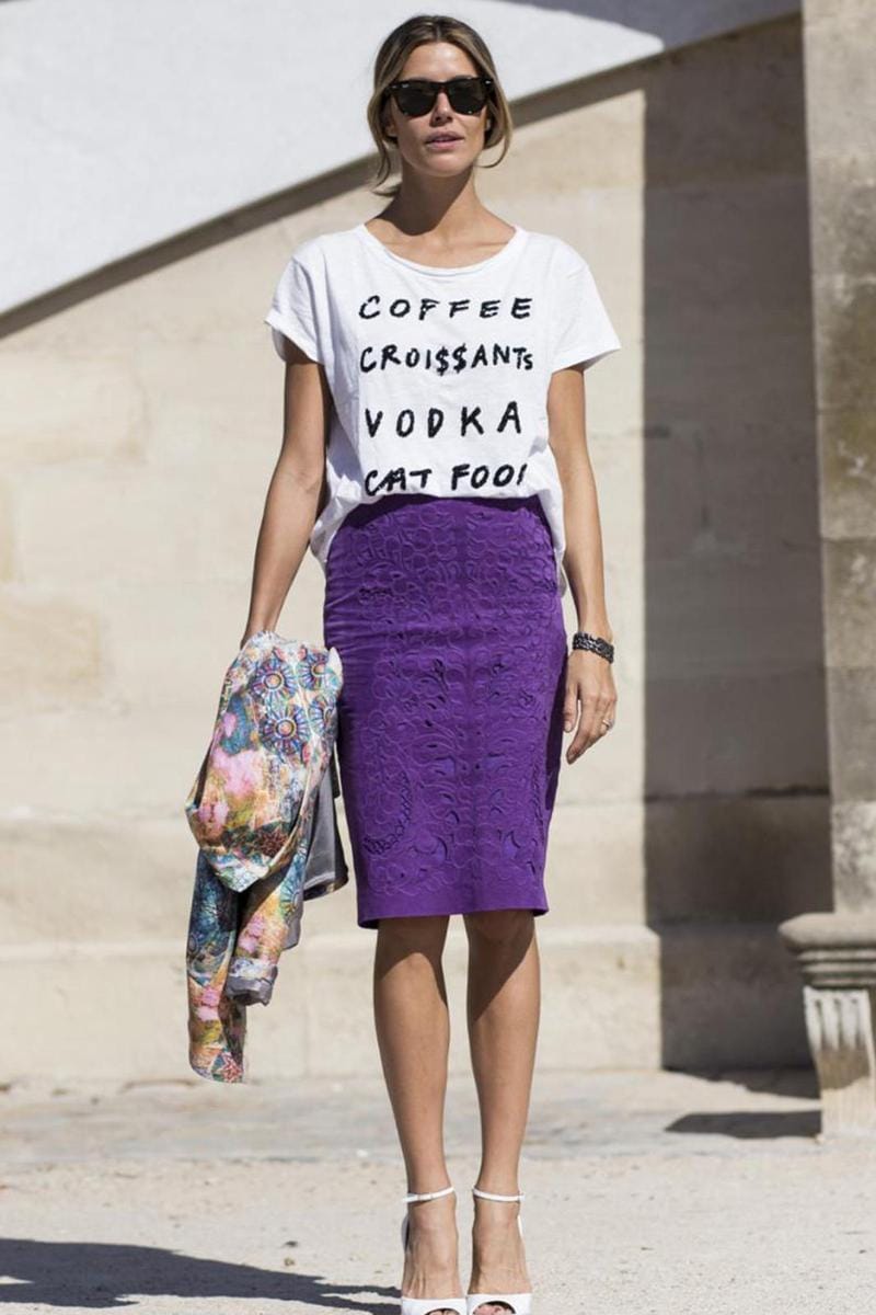 1. Pasangkan t-shirt favoritmu dengan rok berwarna ungu.