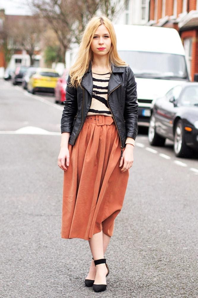3. Gunakan outer seperti leather jacket yang akan membuat tampilan midi skirt-mu makin keren.