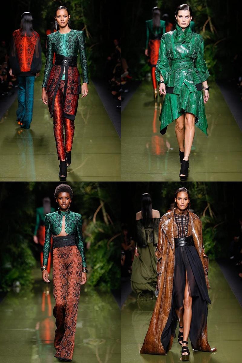 3. Motif kulit ular menjadi sesuatu yang vokal di koleksi ini. Hadir dalam warna jewel tones sebagai dress, coat, hingga celana panjang.