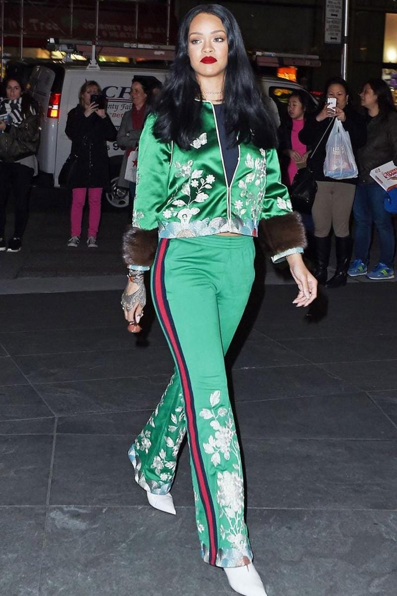 2. Rihanna memilih mengenakan tracksuit yang dihiasi detail bordir dan fur yang flirty.