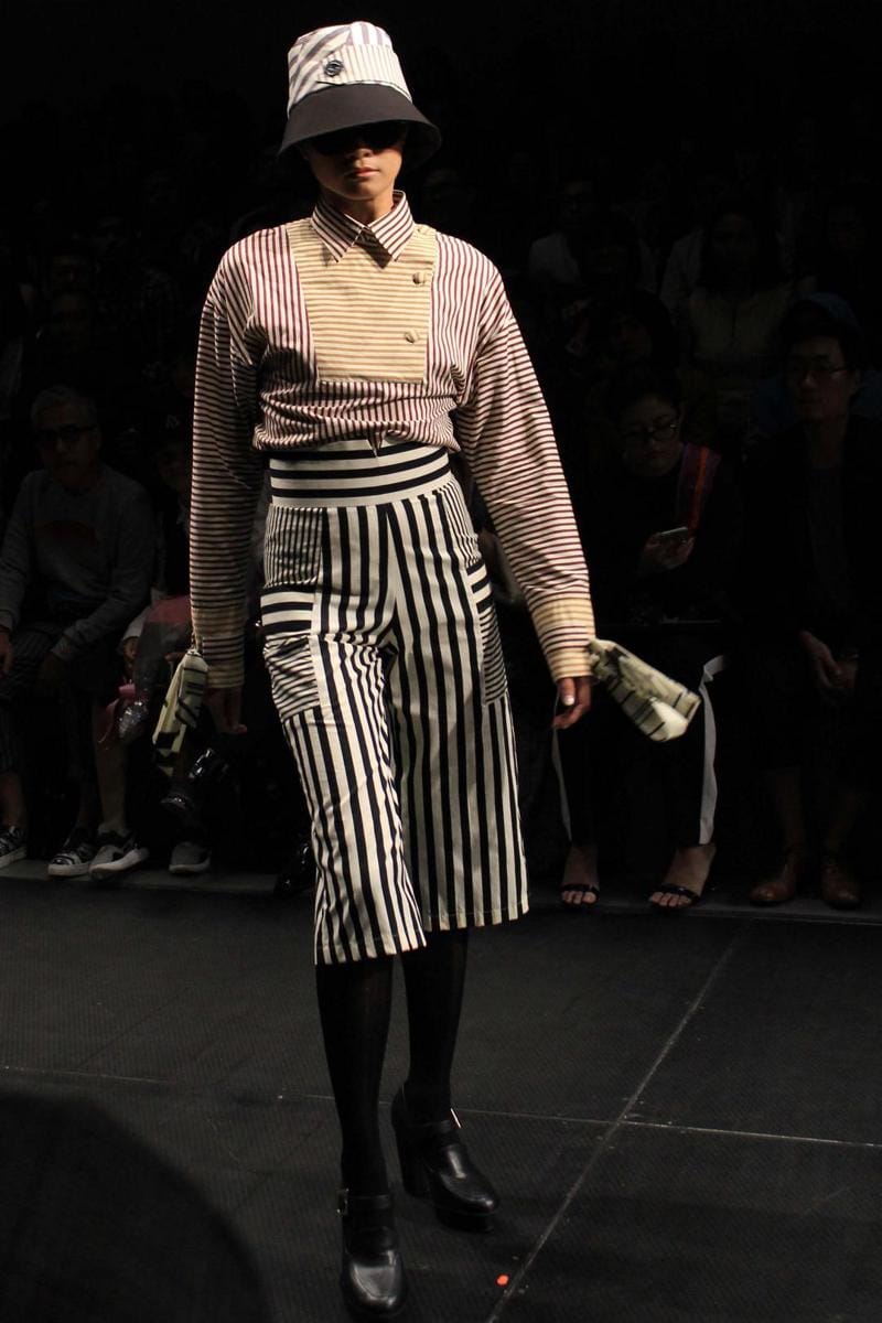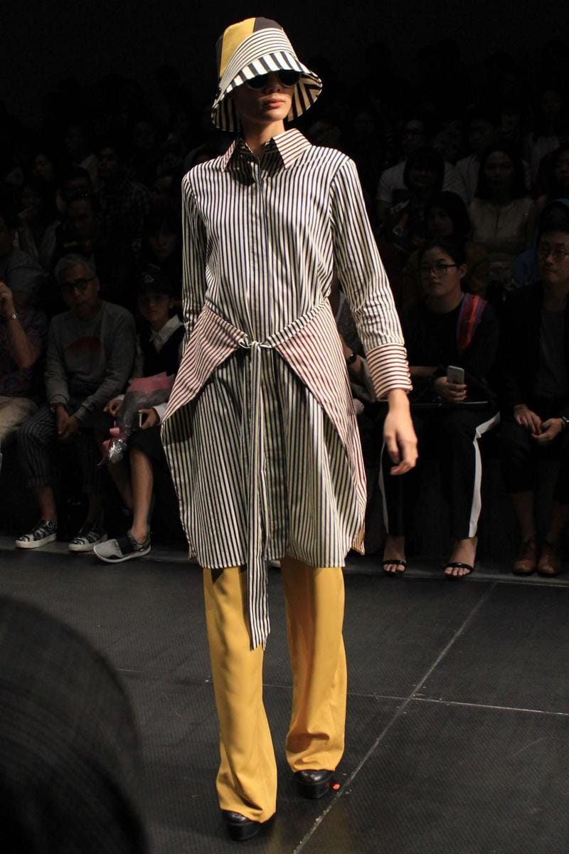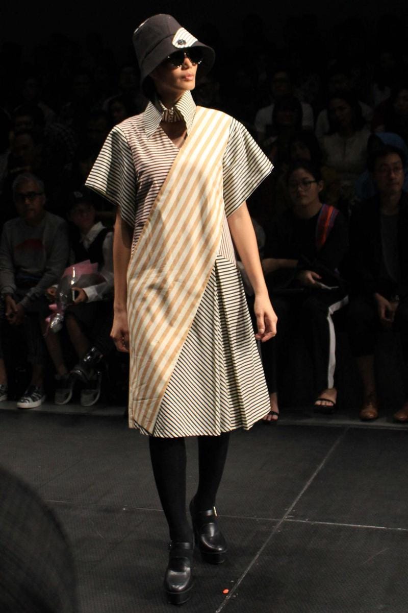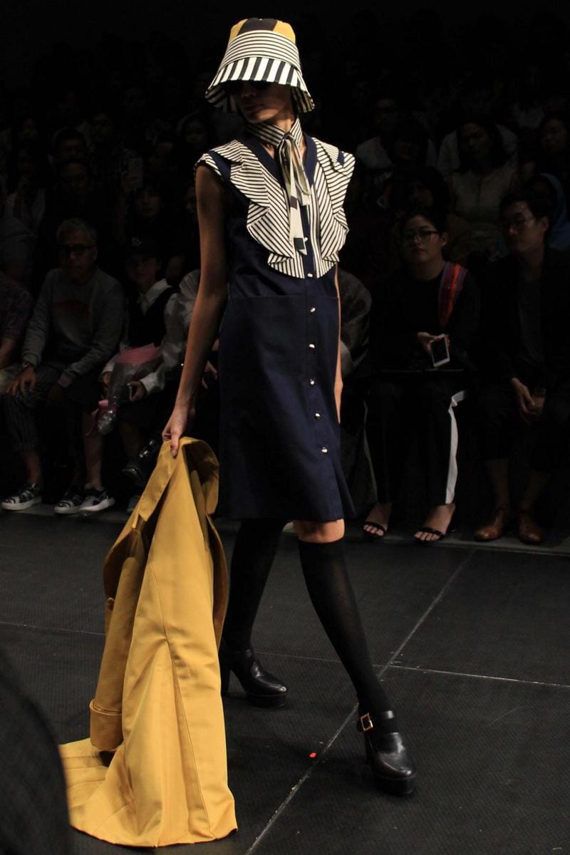 Jika pada sebelumnya banyak didominasi dengan busana tailoring, kali ini koleksinya terasa lebih light dan playful dengan berbagai kemeja garis-garis dan beberapa jaket dekonstruktif. Sebuah tanda yang bagus. Dimana Tri Handoko bermain dengan jiwa yang ceria. Walau dalam aksen tabrak warna, akar androgininya masih terasa. Apalagi dengan bucket hat yang sudah menjadi ciri khas Tri Handoko.