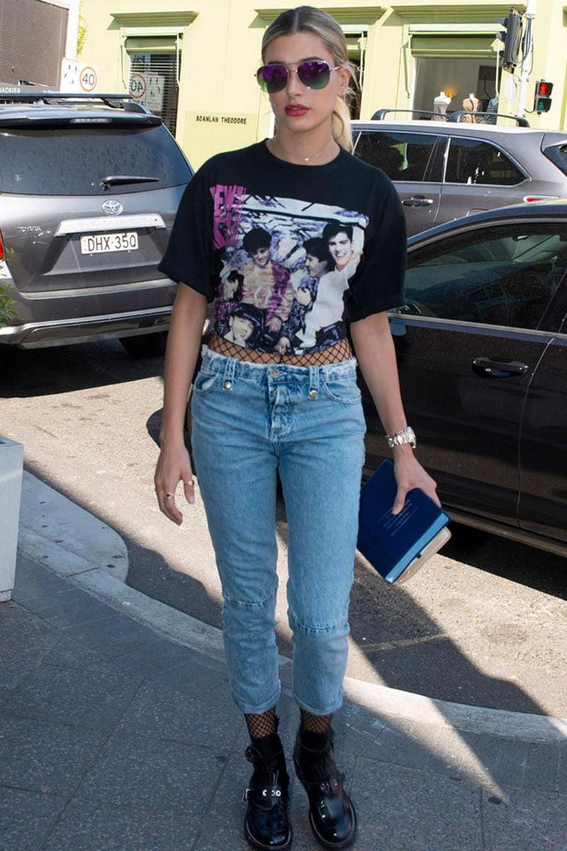 4. Nuansa punk rock jelas terasa pada tampilan Hailey Baldwin, model cantik ini mengenakan fishnet tight, jeans dengan sentuhan vintage band tee.