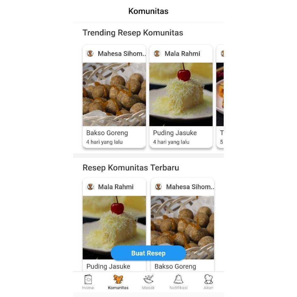 Selain mencoba resep makanan yang sudah disediakan oleh Yummy, kita juga bisa melihat resep lainnya yang diunggah oleh para pengguna aplikasi Yummy dalam fitur Komunitas. Biasanya resep-resep ini terinspirasi oleh resep asli Yummy namun sudah dimodifikasi sesuai dengan selera para pembuatnya. Kamu bisa mencontek resep di sini, siapa tahu ada yang sesuai dengan selera kamu.