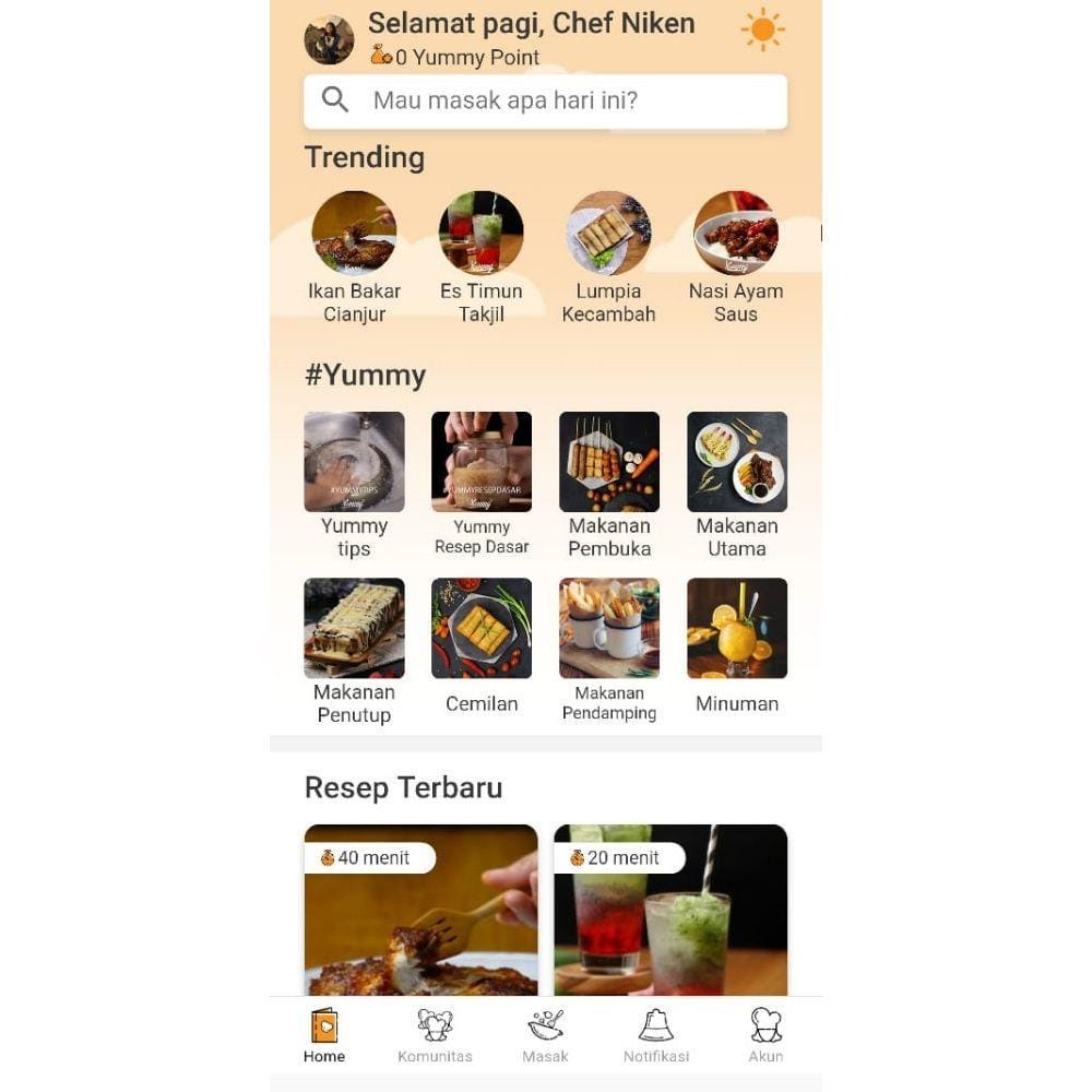 Pertama, saat kamu telah selesai mengunduh dan menginstalasi aplikasi Yummy, kamu akan langsung melihat halaman Home. Pada halaman ini kamu akan dapat melihat beragam resep yang sudah dikategorikan, mulai dari camilan, makanan utama, makanan penutup, hingga minuman. Jadi kamu nggak bingung lagi kan mau masak apa?