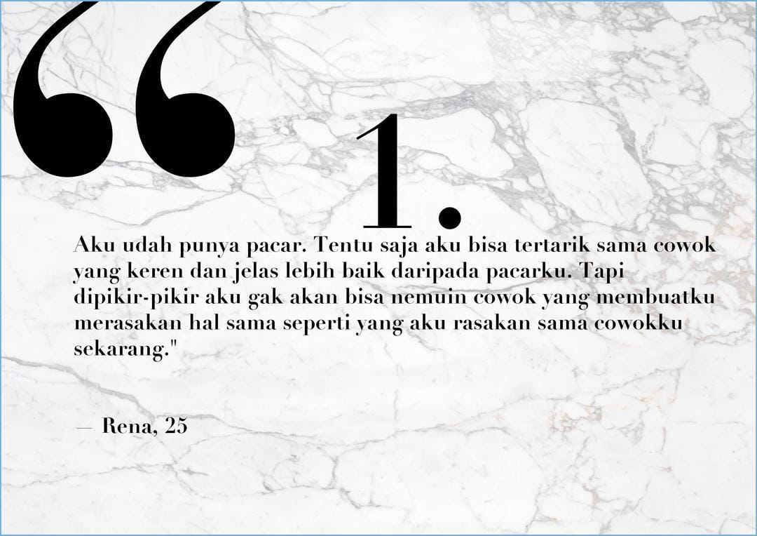 Sebagai gambaran, berikut ini ada 10 cewek yang mau membongkar rahasia tentang seberapa "dekat" mereka dengan perselingkuhan meskipun akhirnya mereka tak melakukannya.