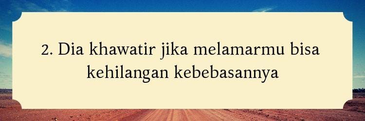 Dia masih ingin punya kebebasan dalam hidupnya adalah faktor lain ketika pacar kamu belum mempunyai niat untuk melamar kamu. Mungkin saja pacar kamu berpikiran bahwa menikah mungkin saja bisa menjadi penghalang dalam melakukan kegiatan yang dia sukai. Selain itu menikah juga dapat memberikan tanggung jawab yang besar bagi laki-laki karena harus menghidupi istri dan anak-anaknya. Karena hal itulah, ia tidak bisa bebas lagi dalam membeli sesuatu dan harus memikirkan keluarganya.