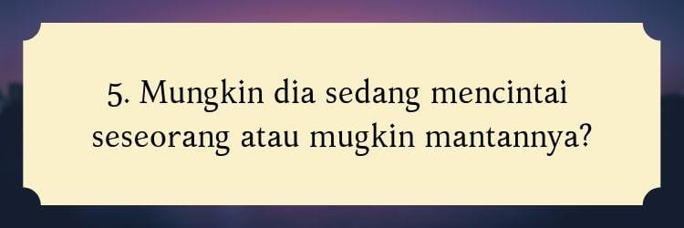 Kalau ini kalian harus benar-benar waspada nih, siapa tahu memang benar kalau alasan ia belum juga melamar kamu karena masih mencintai mantannya. Kamu harus mengobrol jika memang benar ini alasannya, jangan sampai kamu menjalin hubungan dengan dia tapi hati dia dibagi dua dengan sang mantan pacar.