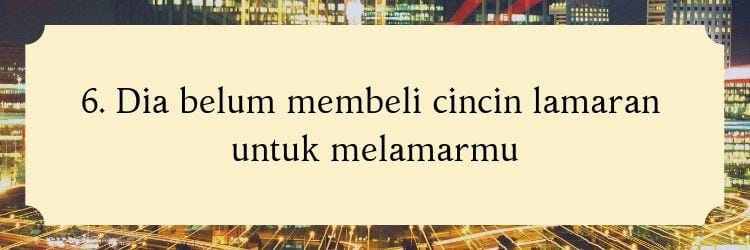 Nah, kamu jangan punya pikiran negatif dulu ya, siapa tahu pacar kamu memang sudah punya niat untuk melamar. Akan tetapi karena kesibukan atau mungkin budget yang belum cukup untuk bisa membeli cincin, akhirnya dia harus menunggu dan berusaha mewujudkannya. Jadi, sabar aja ya kalian.