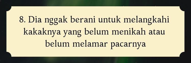 Seperti tradisi lama di Indonesia, mungkin ia merasa tidak diperbolehkan melangkahi kakaknya sebelum dia menikah. Alasan ini biasanya datang dari oran tua pacar kamu yang masih berpegang pada tradisi itu. Atau bisa jadi orangtua kamu yang juga memegang kepercayaan seperti itu yang mengakibatkan pacar kamu tidak berani untuk melangkah lebih jauh denganmu.