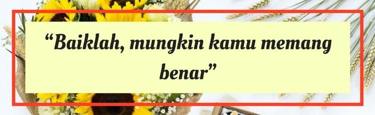 Setiap pasangan tentu pernah menghadapi masalah yang berujung perdebatan. Bila sama-sama nggak mau mengalah, hubungan justru akan semakin hancur dan bisa berakhir. Terkadang, mengalah dan mengatakan bahwa dia yang benar justru lebih mudah diterima olehnya. Kamu bisa membahasnya di lain waktu dengan berkepala dingin bukan?