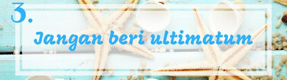 Disadari atau nggak, perempuan senang memberikan ultimatum jika pasangannya berbuat kesalahan. Padahal, cara terbaik dalam menyelesaikan masalah adalah dengan bicara baik-baik dan fokus untuk memperbaiki keadaan. Pertama yang perlu kamu lakukan ialah coba ungkapkan hal-hal egois yang dia lakukan, kemudian beri motivasi kepadanya untuk berubah. Tekankan bahwa ada banyak hal positif yang akan membuat hubungan kalian membaik jika ia mau berubah.