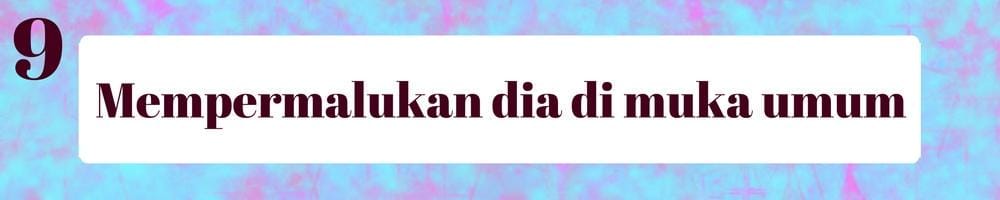 Siapapun tidak suka dibuat malu di muka umum. Bersikap kekanak-kanakan, bertengkar untuk hal – hal kecil yang dilakukan di hadapan orang banyak. Walaupun hal ini sering dilakukan oleh pasangan – pasangan dalam masa penjajakan, sebaiknya Bela menghindari hal ini jika tidak ingin dia ogah untuk menjawab teleponmu atau menjawab pesanmu.