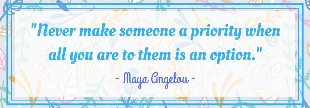 Ketika kita mencintai seseorang, kita selalu berusaha untuk mengutamakannya. Walau pada kenyataannya, dia bahkan hanya menjadikanmu sebagai pilihan. Tentu itu akan membuat hatimu hancur. Maka nggak salah ketika Maya Angelou mengatakan, "Jangan jadikan seseorang sebagai prioritasmu ketika kamu hanya menjadi pilihan baginya."
