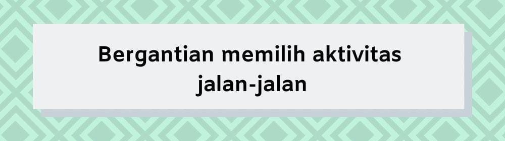 Masing-masing orang memiliki gayanya sendiri ketika jalan-jalan. Ada yang ingin menikmatinya dengan santai dengan mengunjungi tempat-tempat tenang, ada pula yang memilih melalui waktu dengan kegiatan seru. Ada yang lebih suka melakukannya dengan terencana, ada yang cenderung melakukannya tanpa rencana. Bagaimana denganmu?