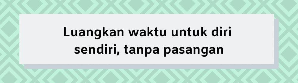 Tentu saja, ada beberapa kegiatan yang mungkin nggak menarik menurutnya atau menurutmu sendiri. Jika terjadi seperti ini, jangan mengorbankan kegiatan tersebut dari daftar keinginanmu, Bela. Sebaliknya, rencanakan waktu untuk diri sendiri agar dapat melakukan aktivitas tersebut tanpa pasangan. Kamu dapat menemuinya setelah menyelesaikan aktivitasmu, kok.