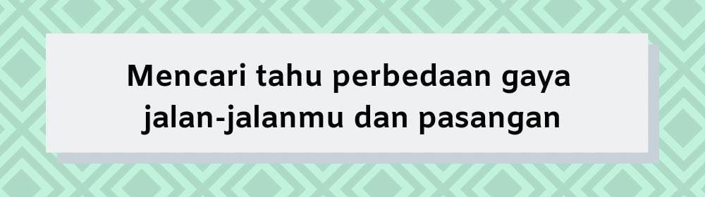 Semua dimulai dari mencari tahu perbedaan gaya jalan-jalan dan merefleksikan perbedaan tersebut sambil mencari solusi terbaik. Hanya karena kamu memiliki preferensi yang berbeda, bukan berarti nggak bisa melampaui hal tersebut. Kuncinya adalah menghargai dirimu dan pasanganmu.