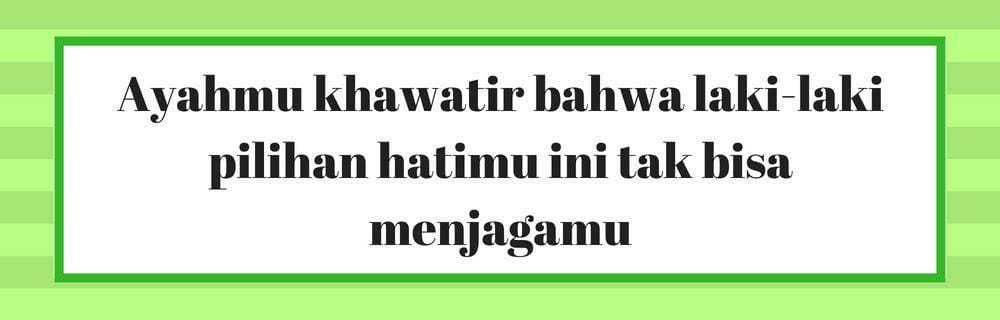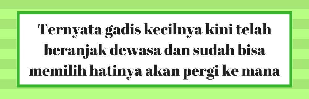 Ayahmu mulai menyadari bahwa kini tempatnya di hatimu sudah bukan dia seorang. Ada laki-laki istimewa lainya bertahta di sana, meski ayahmu tetap yang teristimewa. Diam-diam ia cemburu dengan lelakimu, tapi ayahmu juga mengerti bahwa cepat atau lambat kamu akan beranjak dewasa dan menjalani hidupmu tanpa dirinya lagi.