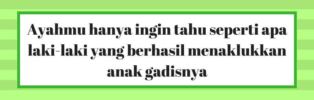 Pergaulanmu kini semakin luas, orang-orang yang kamu hadapi pun semakin banyak. Sampai akhirnya kamu bertemu dengan laki-laki yang membuat hatimu luluh dan jatuh ke sosoknya. Sementara di balik rasa-rasa senang yang tak bisa dijabarkan, ada ayahmu yang hatinya pun terasa campur aduk. Di satu sisi bangga karena anaknya telah dewasa tapi di sisi lain ada kekhawatiran yang belum jelas sebab akibatnya. Gadis kecilnya yang dulu sering kali merengek padanya karena hal kecil, kini sudah mengenal cinta.