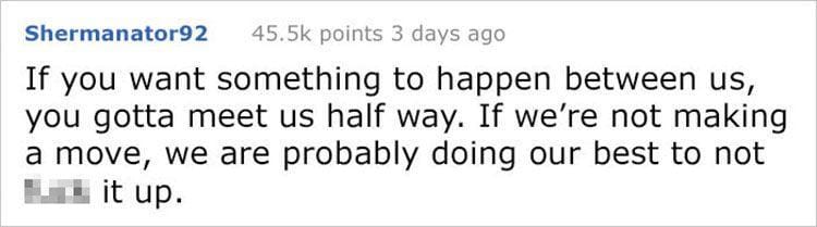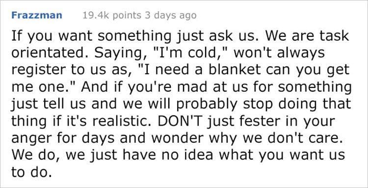 Ada banyak akun Reddit yang mengungkapkan hal serupa, yang berisikan pesan kalau laki-laki nggak suka membaca bahasa tersirat dan nggak akan bersikap sesuai yang pasangannya inginkan jika hanya meminta dengan memberikan kode. Mereka, Kaum Adam, lebih suka jika pasangannya dapat meminta langsung dan menggunakan bahasa yang jelas. Jadi intinya jangan bermain kode, Bela.