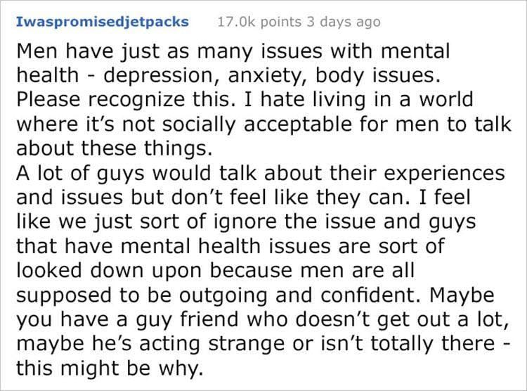 Nggak hanya perempuan yang mengalami masalah kesehatan jiwa, seperti depresi, kecemasan, bahkan ketidakpercayaan diri pada tubuh. Kenyataannya, laki-laki juga merasakan hal yang sama. Namun lebih buruknya, pandangan sosial seakan menunjukkan kalau laki-laki nggak diperbolehkan mengungkapkan hal tersebut dengan bebas karena itu akan membuatnya terlihat lemah.
