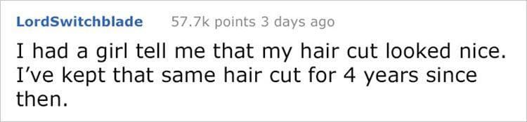 Ketika mendengar pujian, sekalipun itu adalah hal yang sederhana, laki-laki akan sangat senang dan semakin percaya diri. Mereka pun akan menjaga hal yang dipuji itu dalam waktu lama. Misalnya, ia mendapat pujian karena model rambut yang ia miliki. Ia akan memakai gaya rambut yang sama dalam waktu lama.
