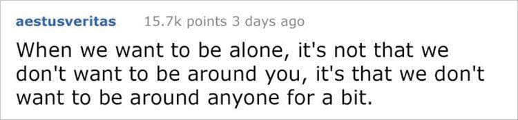Adakalanya laki-laki mengatakan ingin sendiri. Saat itu terjadi, bukan berarti ia nggak ingin berada di sekitarmu. Kenyataannya, ia nggak ingin berada di sekitar siapa pun. Jadi, jangan terburu-buru merasa kalau dirinya nggak menyayangimu lagi, Bela.