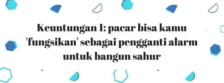 Diakui atau tidak, anak zaman sekarang bisa dibilang paling sensitif dalam masalah waktu. Jadi, seakan sudah merupakan hal yang lazim, ketika ingin bangun pagi dan mengandalkan alarm, eh nasibnya malah cuma di-dismiss saja. Nah, biasanya tanpa disadari, semuanya akan berbeda kalau kamu punya pacar. Menjelang sahur pasti sudah di-SMS atau ditelpon untuk memastikan kamu benar-benar sudah bangun. Kalau begini, yakin nggak mau punya pacar?