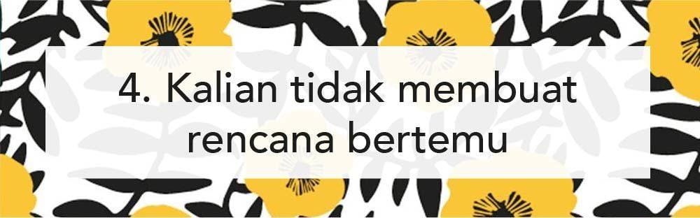 Kamu dan pasangan harus memiliki tujuan yang sama saat menjalani hubungan jarak jauh. Kalau kamu dan pasangan sudah nggak memiliki visi misi yang sama dalam berhubungan dan bahkan nggak ingin merencanakan pertemuan, apakah kamu merasa nyaman dengan hal ini? atau malah sebaliknya?
