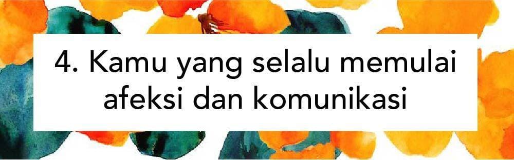 Afeksi adalah sikap kasih sayang. Setiap pasangan akan melakukan hal ini pada pasangannya. Selain itu komunikasi yang baik juga harus terjalin. Namun kalau kamu yang selalu memulai hal ini dan pasanganmu hanya pasif, sebaiknya kamu mulai memikirkannya. Apakah hubungan yang sedang kamu jalani adalah hubungan yang kamu inginkan atau bukan.