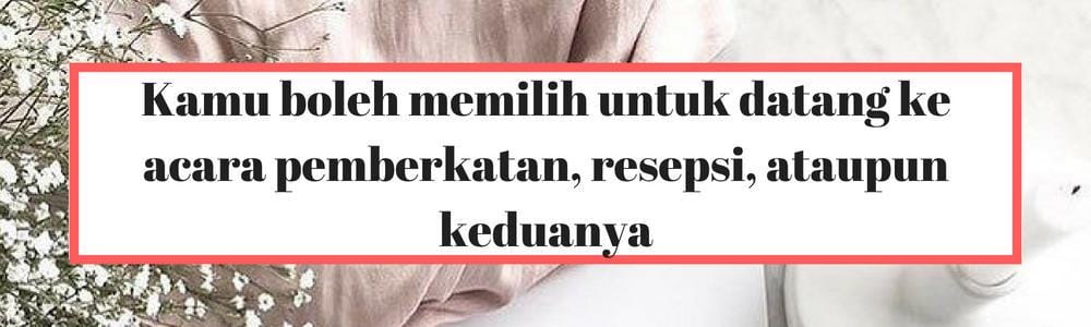 Di Indonesia, hadiah sangat penting. Namun, kamu nggak perlu memutar otak untuk memikirkan sesuatu yang kreatif untuk diberikan. Dalam budaya pernikahan Indonesia, kamu cukup memberikan amplop berisi uang. Di meja penerima tamu pasti sudah ada kotak yang dihias dengan indah di mana kamu bisa menyelipkan amplop langsung ke dalam.