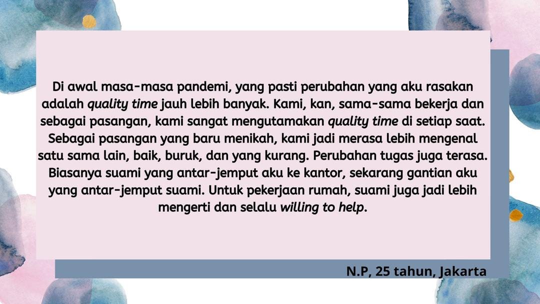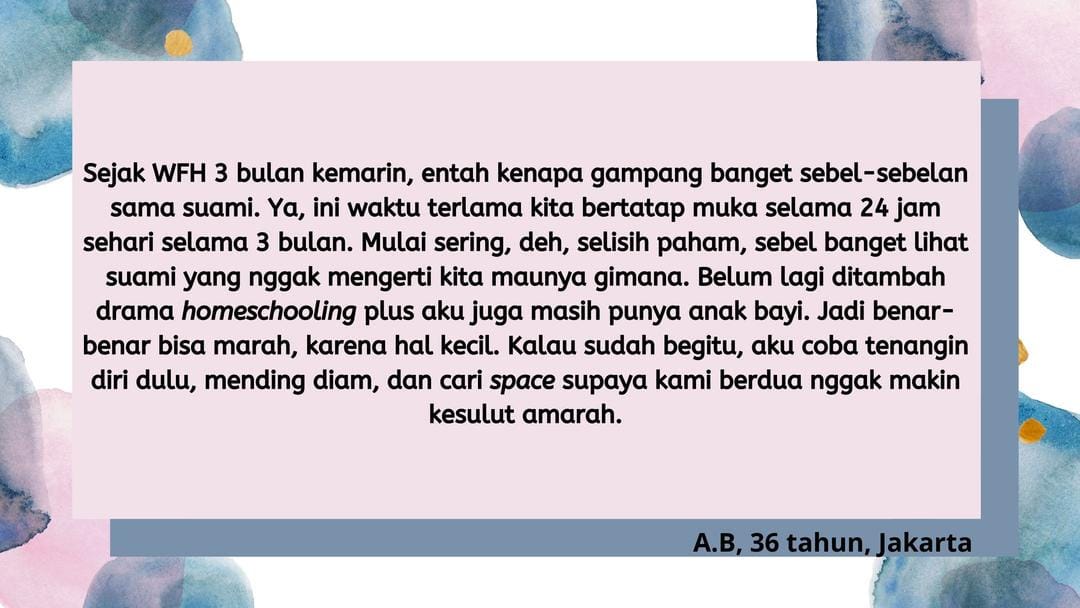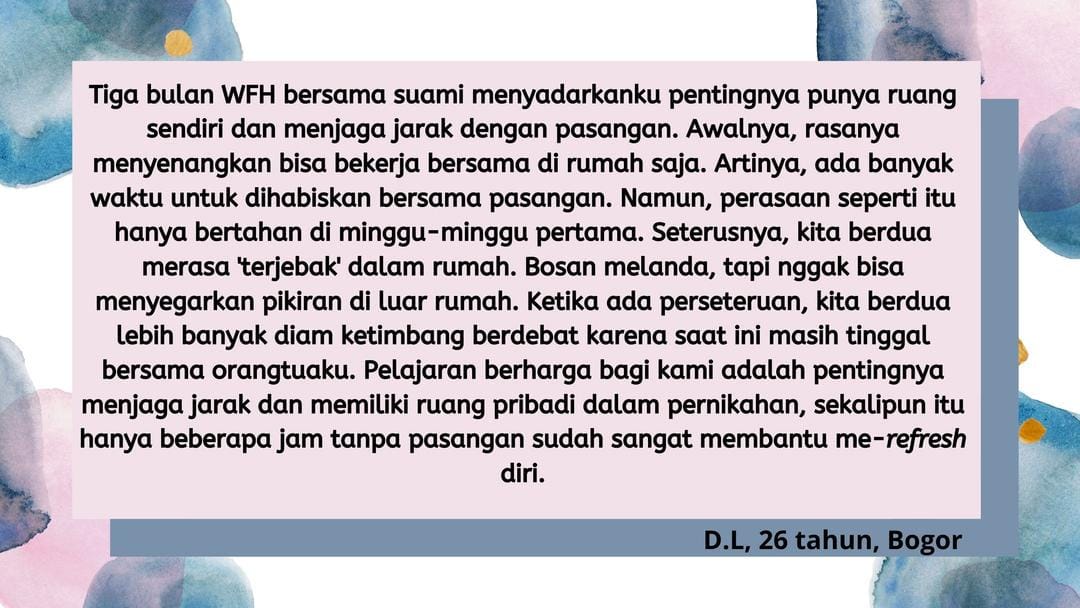 Nggak hanya itu, perubahan juga terjadi pada hubungan dengan orang di rumah, khususnya bagi mereka yang sudah menikah. Masa-masa work from home, ternyata punya dampak tersendiri buat mereka yang telah berumah tangga. Nggak melulu negatif, karena ada juga yang merasakan perubahan positif dalam hubungan mereka.