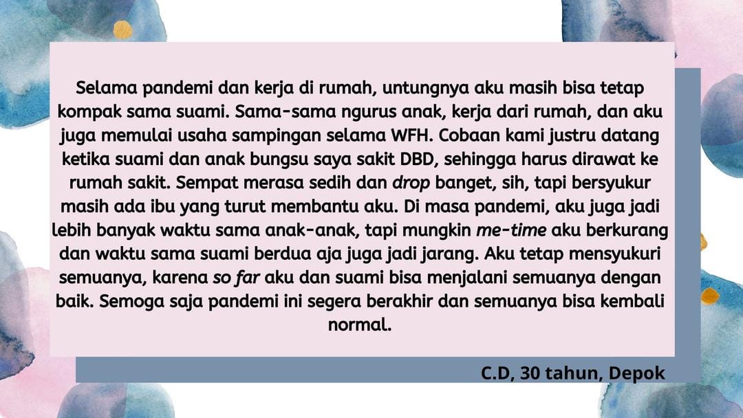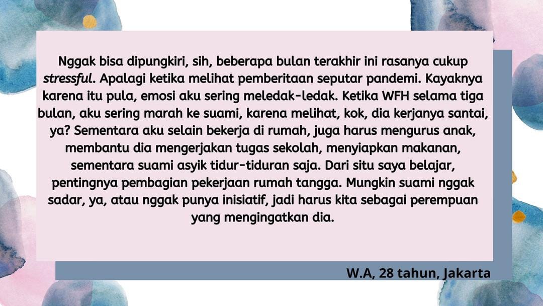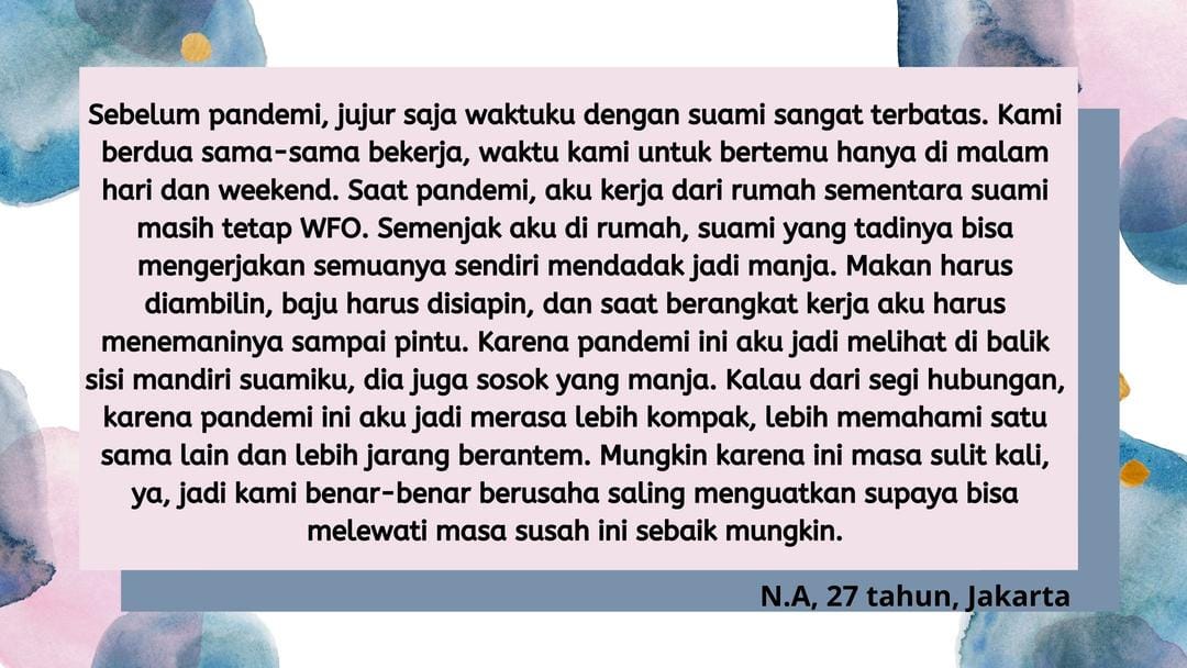 Simak, yuk, cerita 7 perempuan yang merasakan perubahan dalam hubungan pernikahan mereka selama pandemi dan selama menjalankan work from home (WFH).