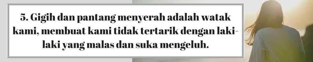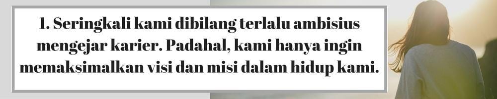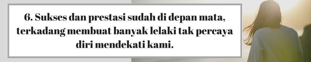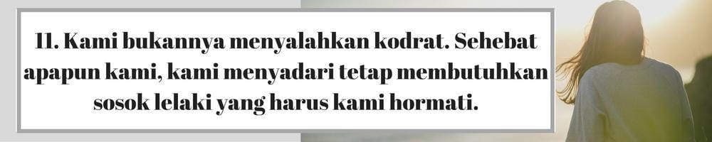 Adakah yang salah dengan kami? Selama bisa saling mendukung mimpi satu sama lain, sepertinya tidak akan ada masalah dengan hal ini. Kami pun akan menyadari, setinggi-tingginya derajat kami, kami tak pernah melupakan kodrat untuk menghormat laki-laki.