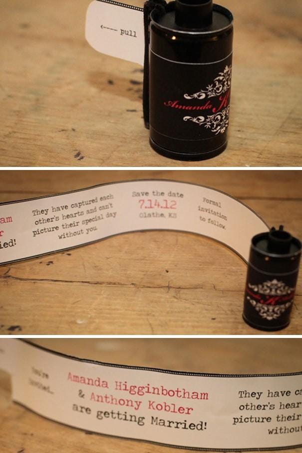 1. Undangan berbentuk rol film kamera kuno. Cukup ditarik kertasnya dan di dalamnya berisi info seputar hari pernikahan. Keren, ya!