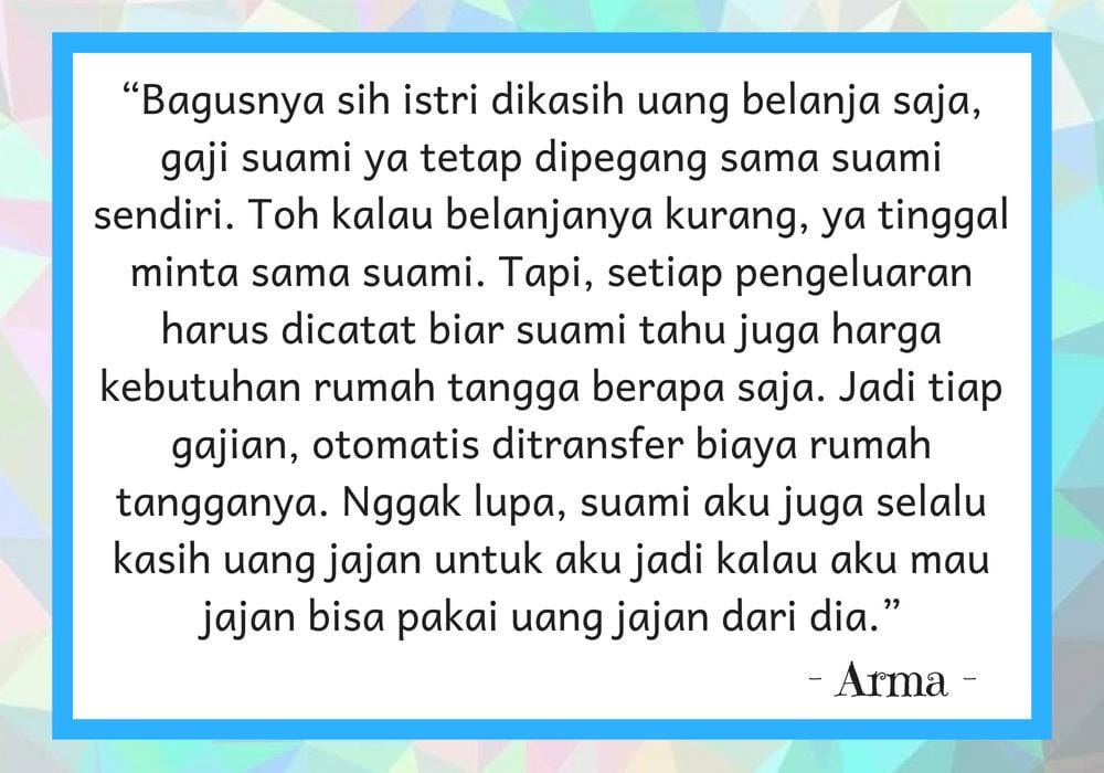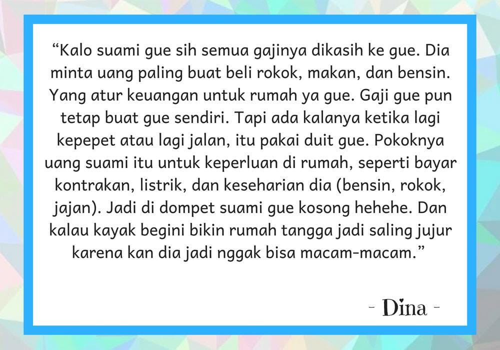 Di zaman sekarang, banyak pasangan yang sama-sama bekerja. Cara pengelolaan uang dalam keluarganya pun berbeda. Sebagian orang mungkin memilih menyerahkan gaji suami sepenuhnya kepada istri dan ia hanya “dijatah” saja. Namun, ada juga suami yang hanya memberikan uang sesuai kebutuhan pada sang istri dan sisanya dipegang oleh suami. Nah, kali ini Popbela sudah menanyakan pada 7 orang mengenai pendapat mereka tentang pengelolaan uang dalam keluarganya. Keep scrolling, ya!
