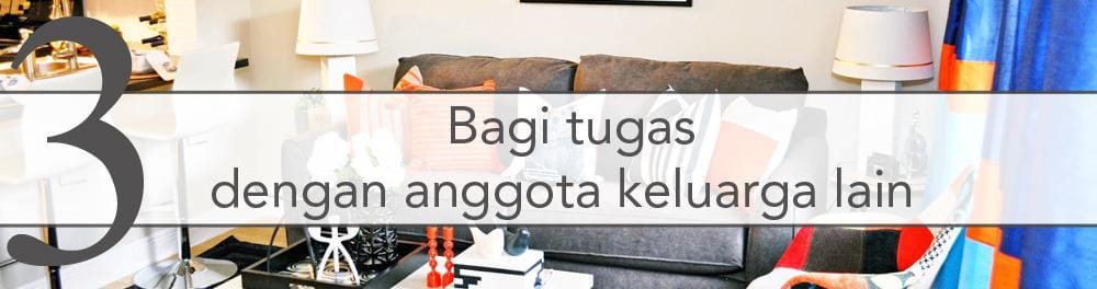 Supaya rumah tetap bersih manfaatkan keberadaan anggota keluarga lainnya. Contohnya untuk newlyweds kamu dapat mengajak suami untuk ikut membersihkan rumah. Lakukan pembagian tugas, seperti menyuci dan menyetrika adalah bagianmu. Sementara untuk bersih-bersih bagian lainnya minta pasangan untuk melakukannya.