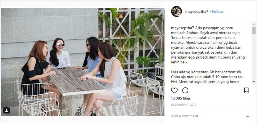 "Lalu ada yang berkomentar seperti, 'Baru juga setahun, coba aja 5-10 tahun baru tahu.' Hei, menurut saya sih semua yang besar dimulai dari yang kecil. Jadi, pernikahan 10 tahunmu tergantung dari yang kamu lakukan sehari-hari. Banyak yang baru nikah seminggu sudah berasa seperti neraka, lho. Jadi kalau satu tahun sudah berhasil baik, congratulations!" Itulah sepenggal tutur Maya dalam caption Instagram-nya.